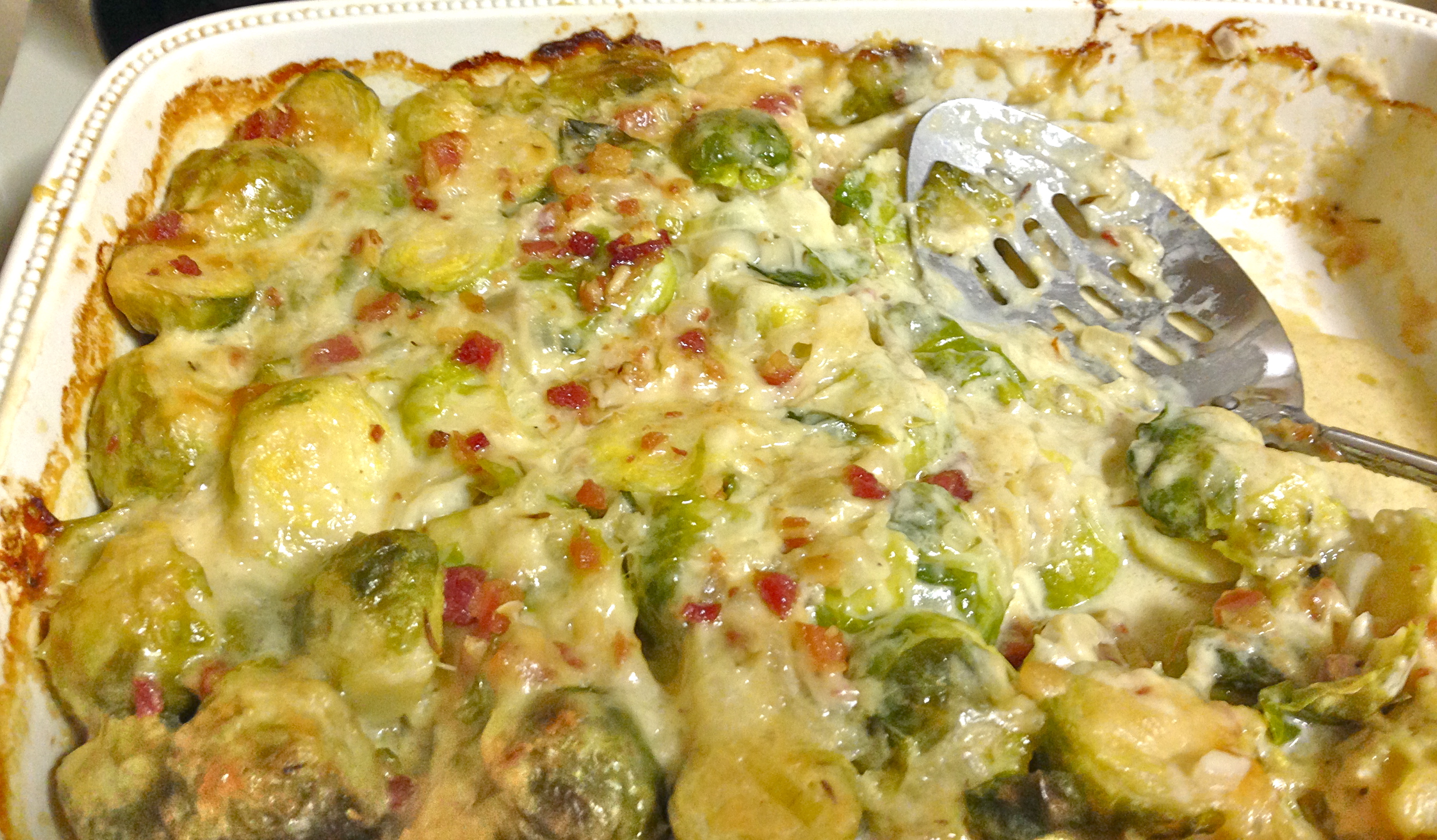 Stir in the 3 oz of the cheese until it’s all melty. Add the Brussels sprouts directly into your mixture and stir to coat. Give it a little taste add salt as necessary.