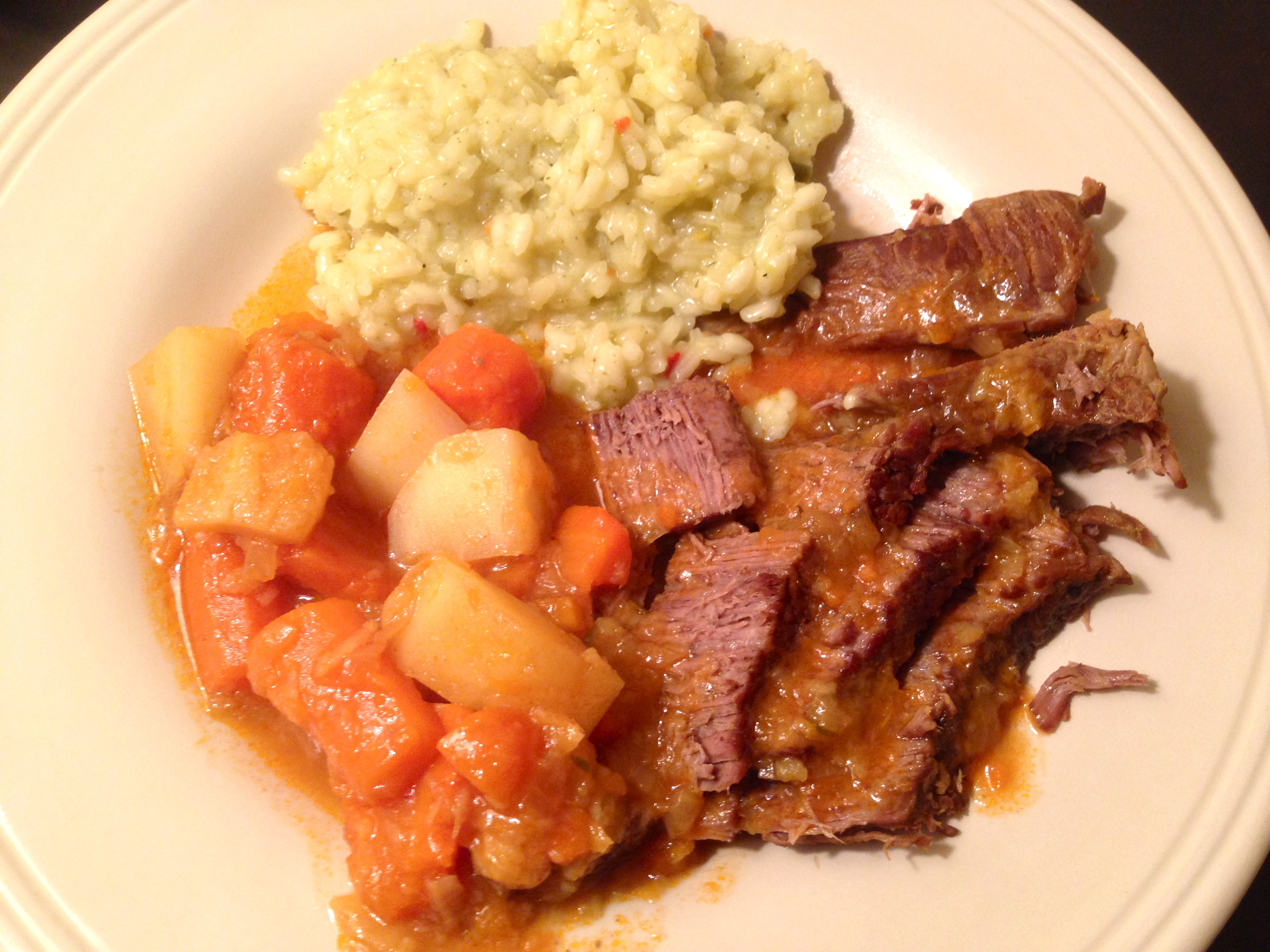 Slice the meat and serve with turnips, parsnips and carrots. I served mine alongside a serving of Lundberg Organic Gluten Free Risotto. This stuff is amazing. AMAZING.