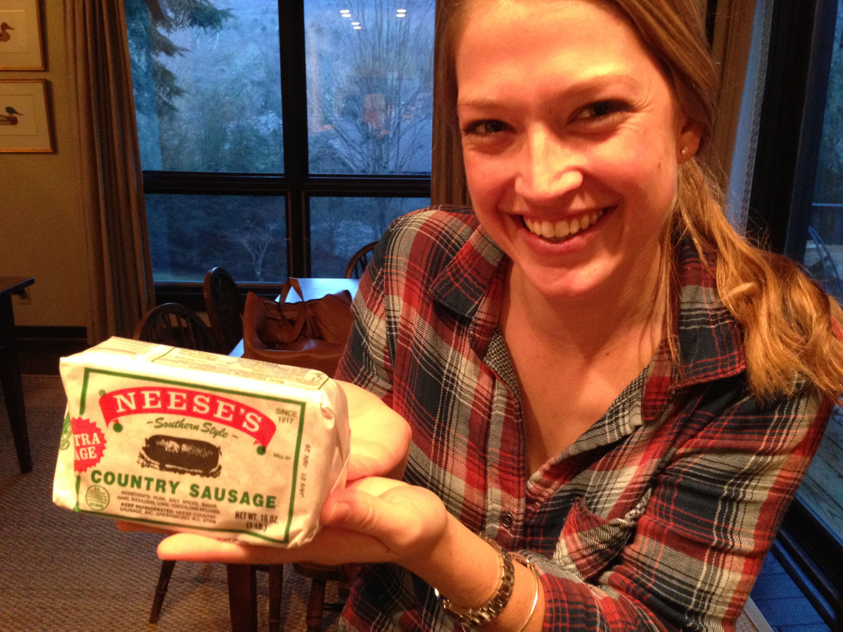I bought this Southern Style sausage with extra sage on a whim and it was FANTASTIC! Then I got my friend Sally to pose with it!