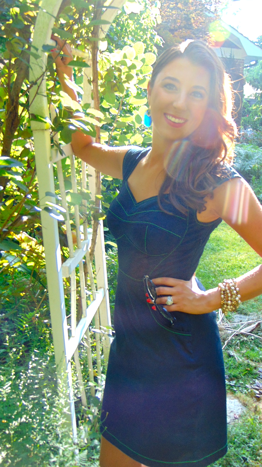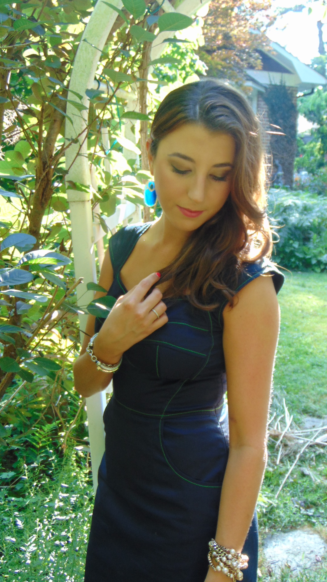 I would definitely order from eShakti again. Overall, the dress was a good fit, with the exception of the bust. You can’t tell from the pictures, but the bust is really tight on me.  Perhaps if I had ordered a dress with my exact measurements, this problem would have been alleviated.  I also had the skirt of this dress taken up several inches.  Despite providing my height (I am 5’6″) this dress was too long. $14 in alterations later and I had one amazing dress! I would wear this to dinner, brunch, a baby or bridal shower.  The neckline is flirty but in no way revealing.