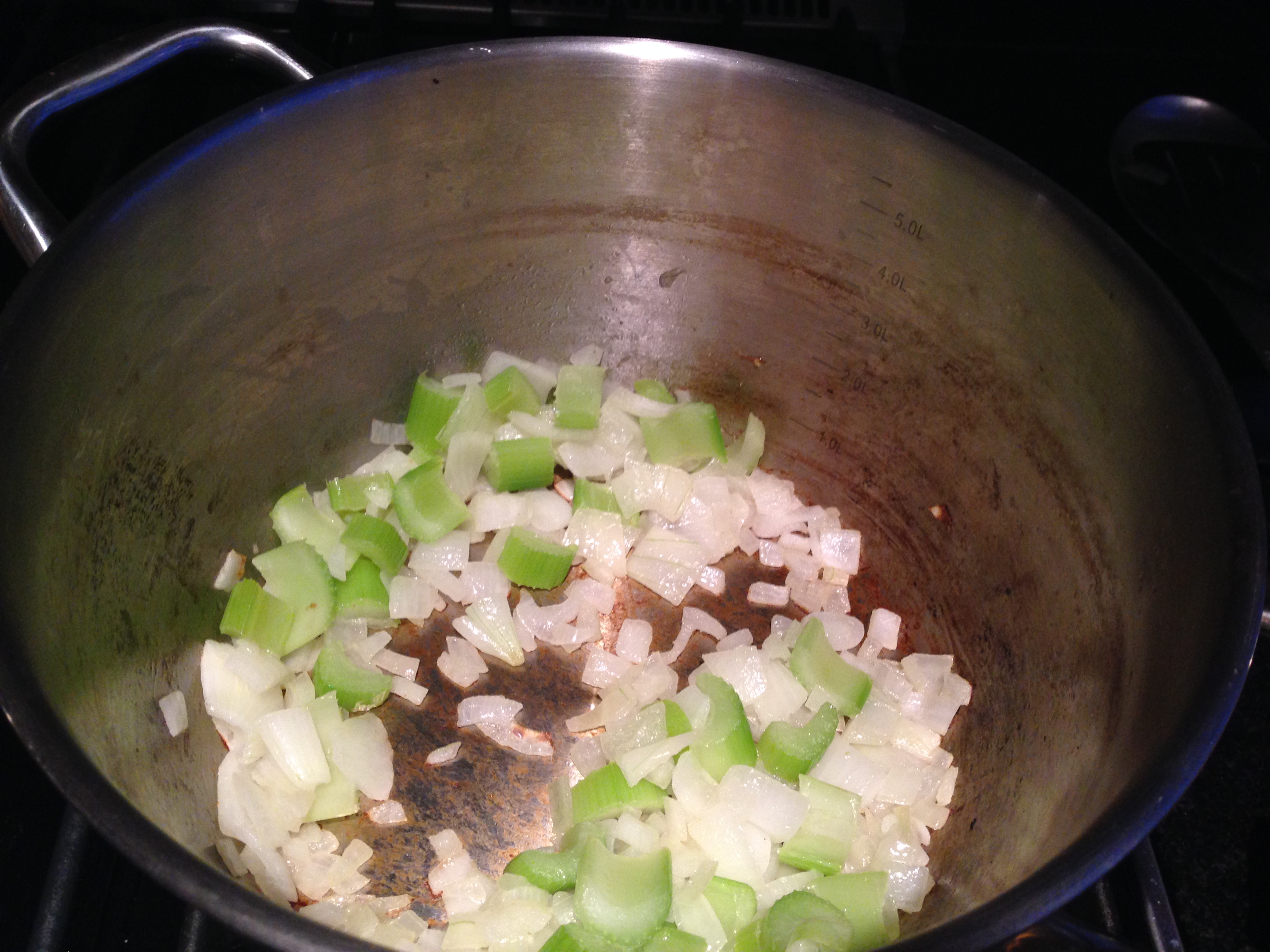 Add butter to a large stock pot. Add chopped onion and celery and cook for about 10 minutes until tender.
