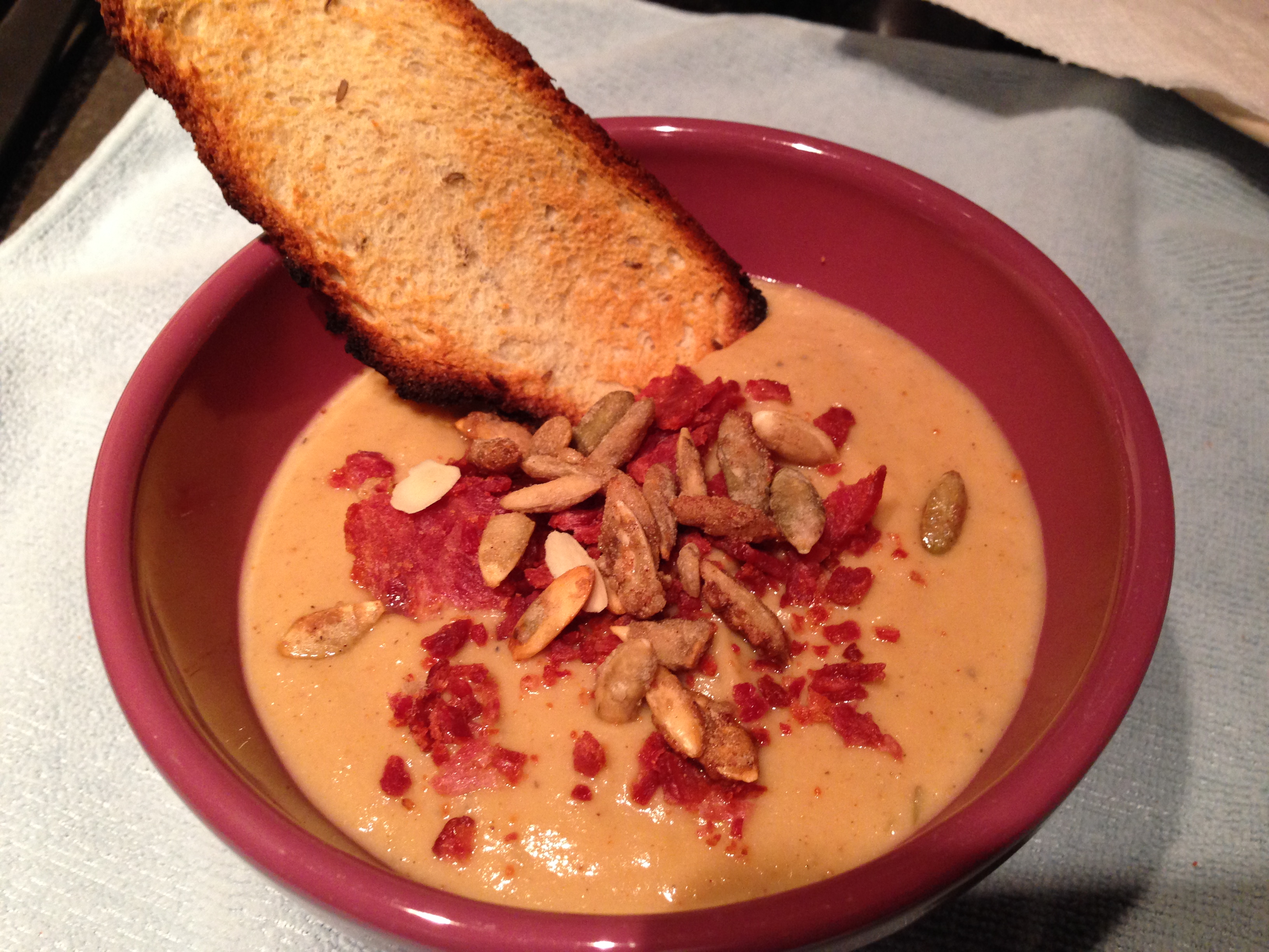 Sprinkle with crumbled turkey bacon and Trader’s Joe’s pumpkin spiced pumpkin seeds!
